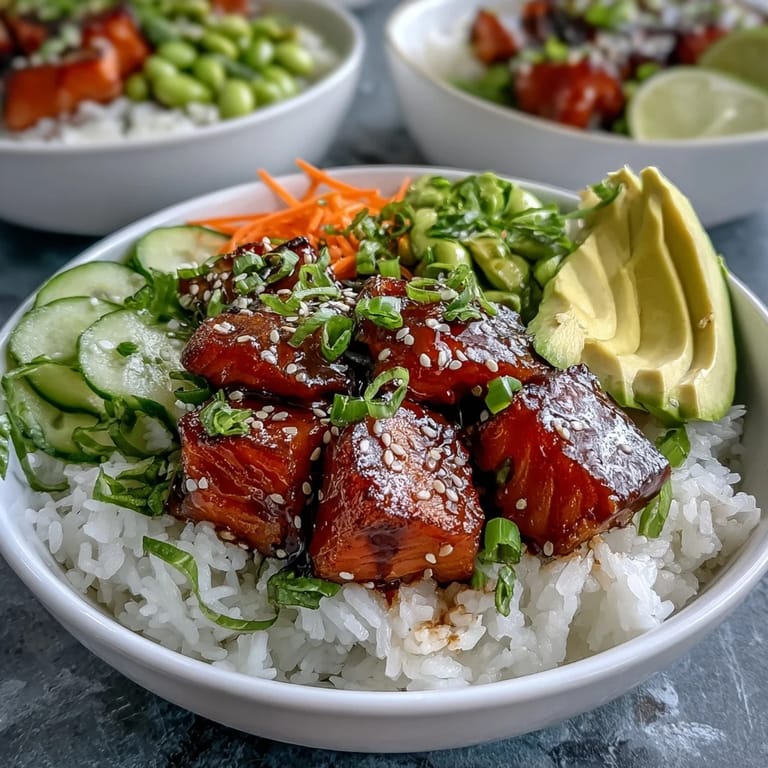 - Top each rice bowl with broiled salmon, then arrange the cucumber, carrots, edamame, and avocado in little sections so everything is visible and appetizing. This isn't just about taste, it's about making something you actually want to look at.
