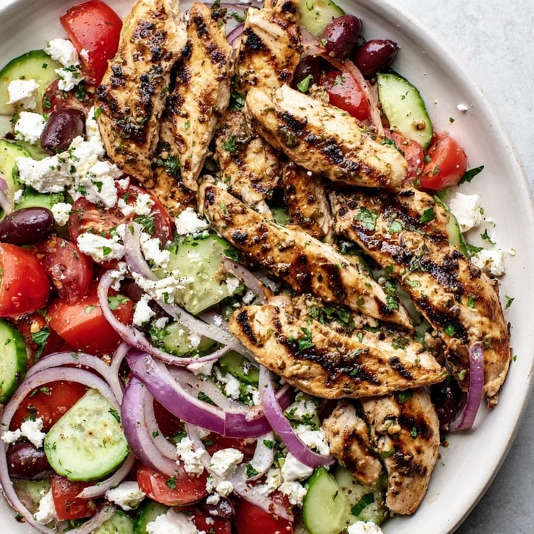 Save There's something about the smell of lemon and oregano hitting a hot grill that instantly transports me to a sun-soaked taverna I visited years ago. I came home determined to recreate that feeling, and this Greek salad with grilled chicken became my answer—it's not fancy, but it tastes like summer every single time I make it. The beauty is how simple it is: juicy tomatoes, cool cucumber, briny olives, tangy feta, and perfectly charred chicken that pulls everything together. What started as a craving turned into a weeknight staple I make without thinking twice.