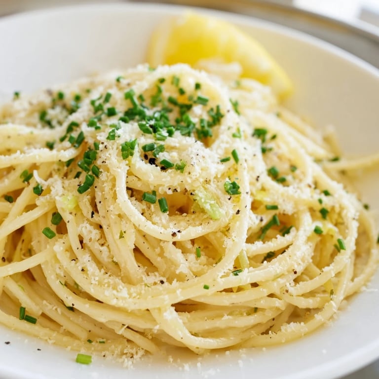 - Divide the pasta into bowls right away while it's still steaming. Top with fresh chives or scallions, a little more Parmesan, and a squeeze of fresh lemon juice just before eating.