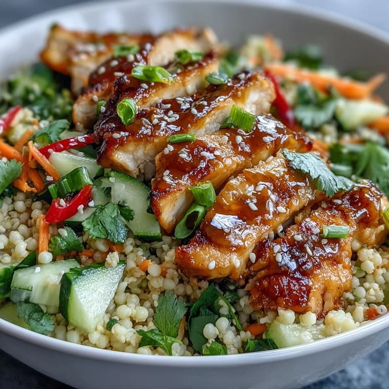Save One Tuesday afternoon, my coworker came back from lunch raving about a sesame-ginger bowl she'd grabbed from a new spot downtown, and I found myself genuinely curious about recreating it at home. The combination of tender chicken, those chewy pearl couscous grains, and a dressing that tasted like it had secrets in it kept me thinking about dinner all week. When I finally attempted it, I realized how simple the magic was: good soy sauce, fresh ginger, and the courage to let flavors speak for themselves without fussing. Now it's become my go-to when I want something that feels restaurant-quality but comes together in less time than it takes to order takeout.