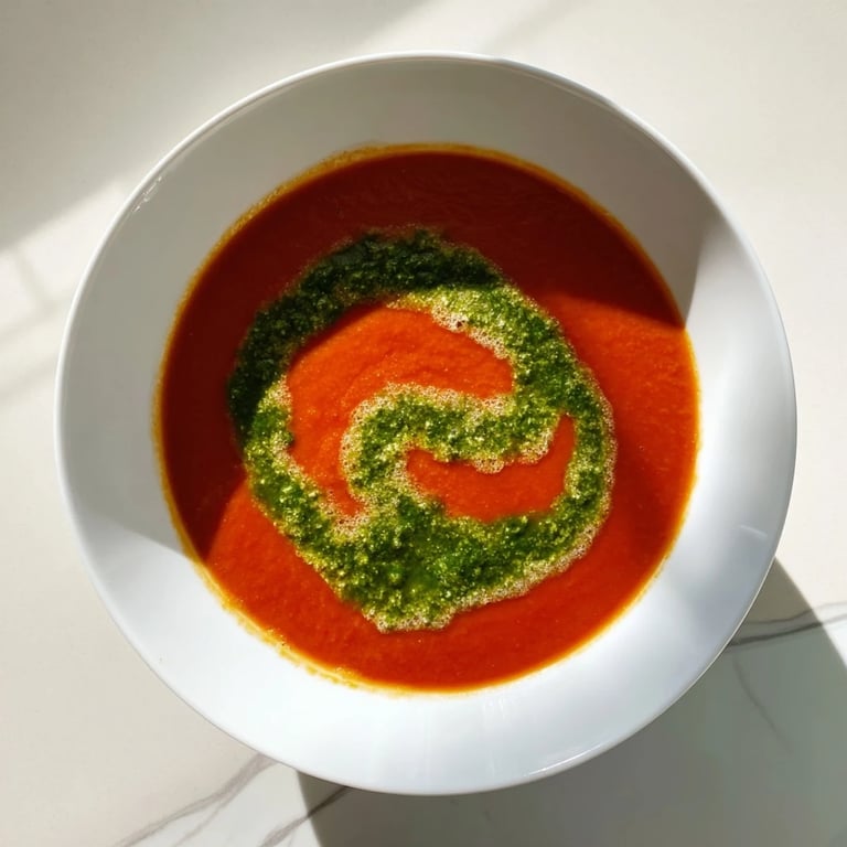 I started making this soup when I needed something reliable on cold evenings. One night I had leftover basil wilting in the fridge and decided to blend it into pesto instead of stirring it in whole. That swirl of green against the red made everyone at the table pause before their first spoonful. Now I always make extra pesto because someone inevitably asks for more to drizzle on top.